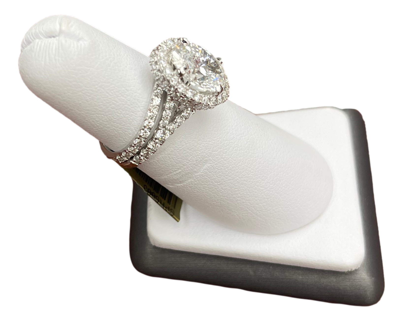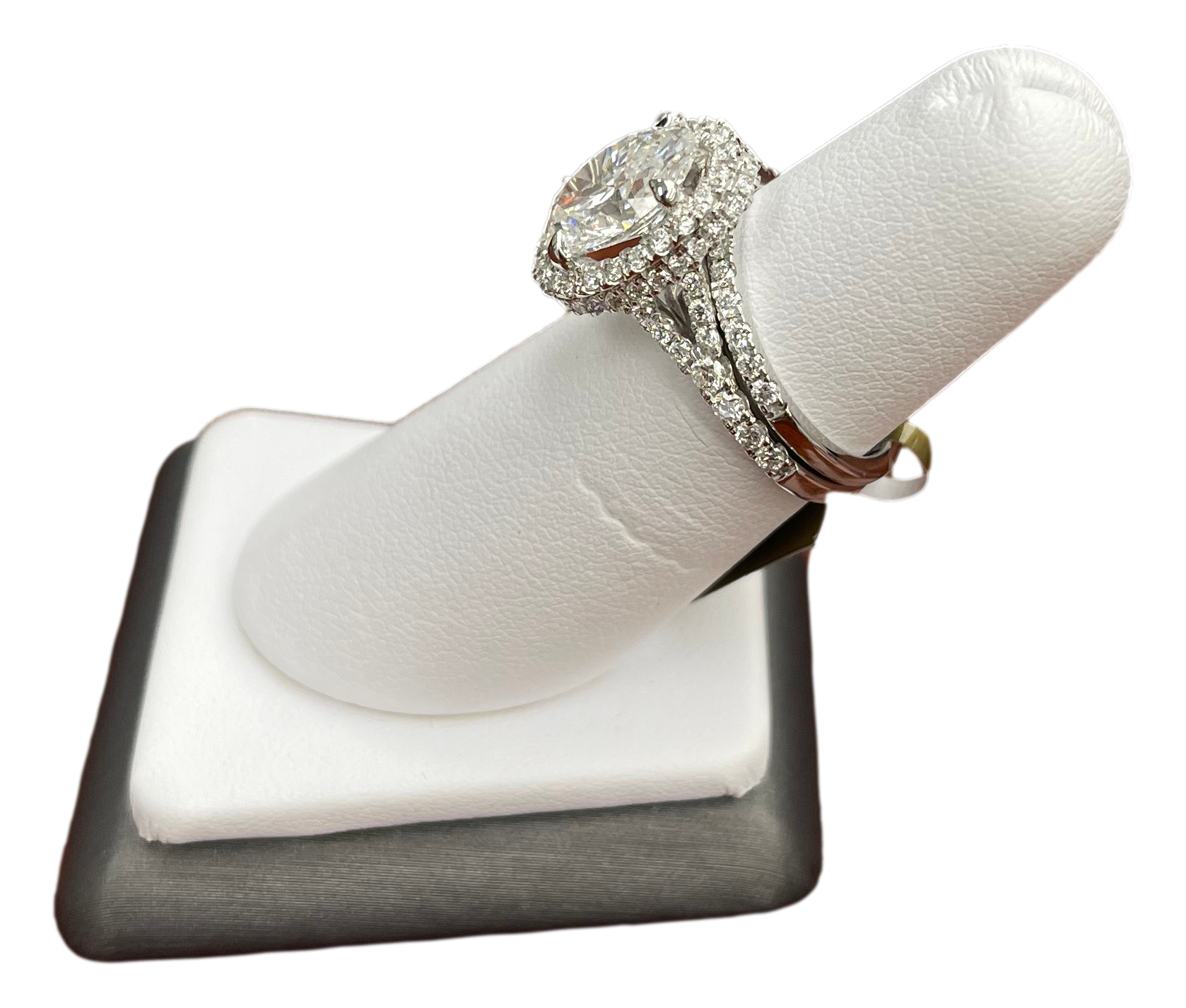 This stunning 14k white gold wedding set features a dazzling 3ct lab grown oval diamond centerpiece, artfully surrounded by 1.15 carats of smaller diamonds that add unmatched brilliance. Designed to capture timeless elegance, this ring can be custom sized to ensure the perfect fit, making it a truly unique symbol of your love and commitment. Elevate your special moments with this exquisite ring that combines exceptional craftsmanship with radiant beauty.