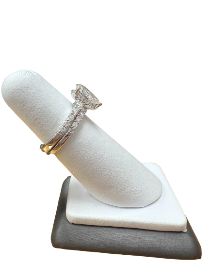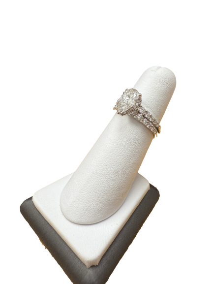 Elevate your special moment with this exquisite 14k white gold wedding set featuring a stunning 1.56 ct pear-shaped lab-grown diamond. Surrounding it are 51 brilliant round diamonds totaling 0.97 cttw, adding extra sparkle and elegance. Designed for comfort and beauty, this set comes in size 7 but can be sized to fit perfectly. Celebrate your love with a ring that combines sustainable luxury and timeless style.